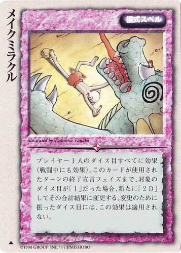 ![]() ![]() | メイクミラクル 儀式スペル 魔道士の黙示録 ▲ プレイヤー1人のダイス目すべてに効果(戦闘中にも効果)。このカードが使用されたターンの終了宣言フェイズまで、対象のダイス目が「1」だった場合、新たに「2D」してその合計結果に変更する。変更のために振ったダイス目には、この効果は適用されない。 illustrated by Toshihisa Tanaka |