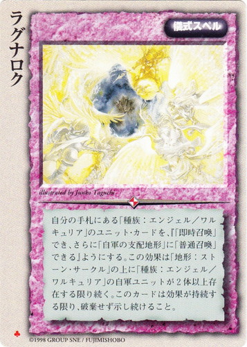 ![]() ![]() | ラグナロク 儀式スペル 魔道士の黙示録 ♣ 自分の手札にある「種族:エンジェル/ワルキュリア」のユニットカードを『「即時召喚」でき、さらに「自軍の支配地形」に「普通召喚」できる』ようになる。この効果は「地形:ストーン・サークル」の上に「種族:エンジェル/ワルキュリア」の自軍ユニットが2体以上存在する限り続く。このカードは効果が持続する限り、破棄せず示し続けること。 illustrated by Junko Taguchi |