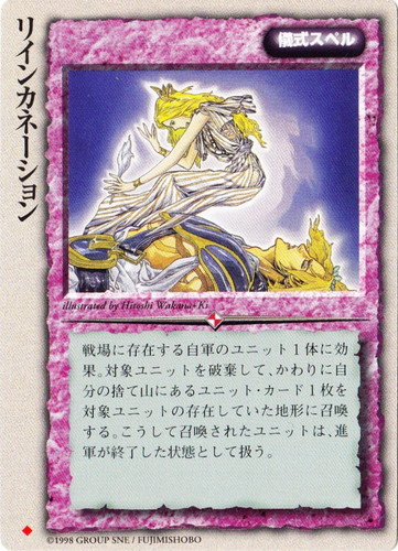 ![]() ![]() | リインカネーション 儀式スペル 魔道士の黙示録 ◆ 戦場に存在する自軍のユニット1体に効果。対象ユニットを破棄して、かわりに自分の捨て山にあるユニット・カード1枚を対象ユニットの存在していた地形に召喚する。こうして召喚されたユニットは、進軍が終了した状態として扱う。 illustrated by Hitoshi Wakana+Ki |