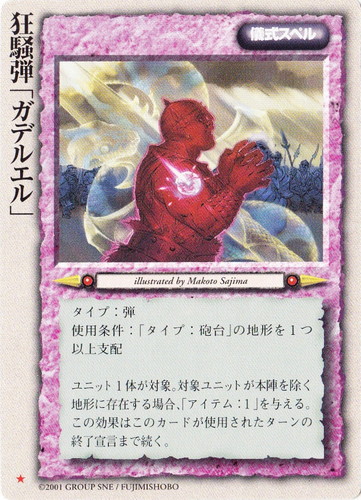 ![]() ![]() | 狂騒弾「ガデルエル」 儀式スペル 灼熱の百年戦争 ★ タイプ:弾 使用条件:「砲台」の地形を1つ以上支配 ユニット1体が対象。対象ユニットが本陣を除く地形に存在する場合、「アイテム:1」を与える。この効果はこのカードが使用されたターンの終了宣言まで続く。 illustrated by Makoto Sajima |