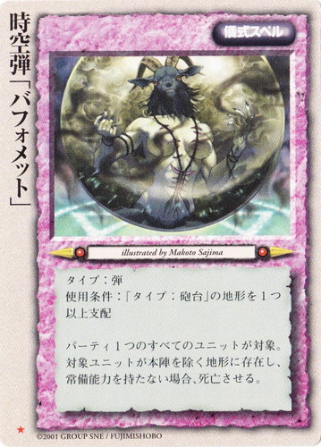 ![]() ![]() | 時空弾「バフォメット」 儀式スペル 灼熱の百年戦争 ★ タイプ:弾 使用条件:「砲台」の地形を1つ以上支配 パーティ1つのすべてのユニットが対象。対象ユニットが本陣を除く地形に存在し、常備能力を持たない場合、死亡させる。 illustrated by Makoto Sajima |