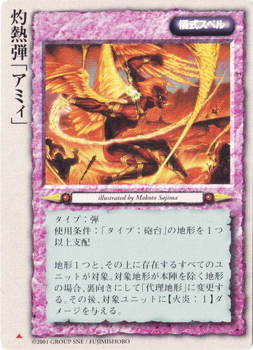 ![]() ![]() | 灼熱弾「アミィ」 儀式スペル 灼熱の百年戦争 ▲ タイプ:弾 使用条件:「砲台」の地形を1つ以上支配 地形1つと、その上に存在するすべてのユニットが対象。対象地形が本陣を除く地形の場合、裏向きにして「代理地形」に変更する。その後、対象ユニットに【火炎:1】ダメージを与える。 illustrated by Makoto Sajima |