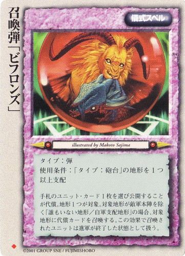 ![]() ![]() | 召喚弾「ビフロンズ」 儀式スペル 灼熱の百年戦争 ◆ タイプ:弾 使用条件:「砲台」の地形を1つ以上支配 手札のユニット・カード1枚を選び公開することが代償。地形1つが対象。対象地形が敵軍本陣を除く「誰もいない地形/自軍支配地形」の場合、対象地形に代償カードを召喚する。この効果で召喚されたユニットは進軍が終了した状態として扱う。 illustrated by Makoto Sajima |