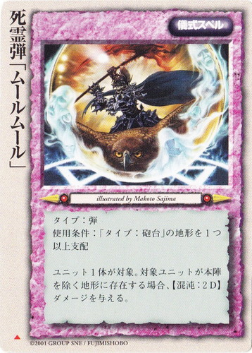 ![]() ![]() | 死霊弾「ムールムール」 儀式スペル 灼熱の百年戦争 ▲ タイプ:弾 使用条件:「砲台」の地形を1つ以上支配 ユニット1体が対象。対象が本陣を除く地形に存在する場合、【混沌:2D】ダメージを与える。 illustrated by Makoto Sajima |