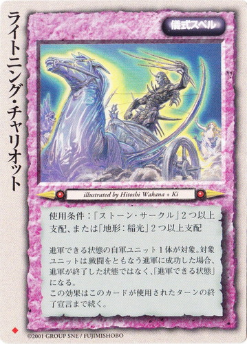 ![]() ![]() | ライトニング・チャリオット 儀式スペル 灼熱の百年戦争 ◆ 使用条件:「ストーン・サークル」1つ以上支配、または「地形:稲光」2つ以上支配 進軍できる状態の自軍ユニット1体が対象。対象ユニットは戦闘をともなう進軍に成功した場合、進軍が終了した状態ではなく、「進軍できるじょうたい」になる。 この効果はこのカードが使用されたターンの終了宣言まで続く。 illustrated by Hitoshi Wakana+Ki |