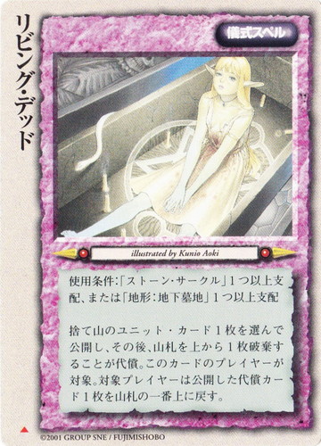 ![]() ![]() | リビング・デッド 儀式スペル 灼熱の百年戦争 ▲ 使用条件:「ストーン・サークル」1つ以上支配、または「地形:地下墓地」1つ以上支配 捨て山のユニット・カード1枚を選んで公開し、その後、山札を上から1枚破棄することが代償。このカードのプレイヤーが対象。対象プレイヤーは公開した代償カード1枚を山札の一番上に戻す。 illustrated by Kunio Aoki |