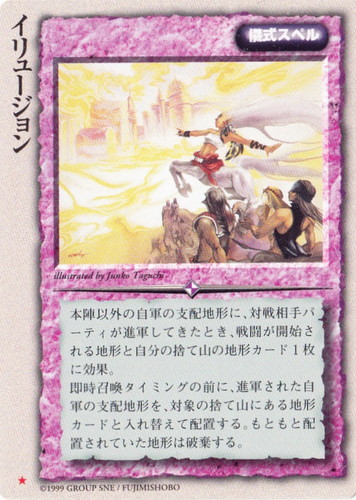 ![]() ![]() | イリュージョン 儀式スペル 空中庭園の降臨 ★ 本陣以外の自軍の支配地形に、対戦相手パーティが進軍してきたとき、戦闘が開始される地形と自分の捨て山の地形カード1枚に効果。 即時召喚タイミングの前に、進軍された自軍の支配地形を、対象の捨て山にある地形カードと入れ替えて配置する。もともと配置されていた地形は破棄する。 illustrated by Junko Taguchi |