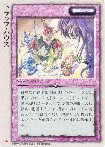 ![]() ![]() | トラップ・ハウス 儀式スペル 空中庭園の降臨 ▲ 戦場に存在する本陣以外の地形1つに効果。このカードを「リミット:8」「タイプ:罠」の地形カードとして、対象の地形と入れ替えで配置する。これ以降、このカードは儀式スペルではなくなり、地形として扱われる。もともと配置されていた地形は破棄する。 illustrated by Shikidouji |