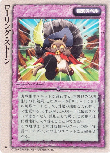 ![]() ![]() | ローリング・ストーン 儀式スペル プロモーションカード(Sレギュレーション) ★ ブロック:六王国 使用条件:「ストーン・サークル」1つ以上支配 地形1つが対象。対象が本陣の除く敵軍支配地形の場合、このカードを「地形:ローリング・ストーン/リミット:8」の地形カードとして扱い入れ替えで配置する。この地形は「代理地形」と入れ替えることができない。この地形は、次の敵軍ターンの終了宣言フェイズに、その上のユニットごと破棄される。 illustrated by Tsukapon 復刻2 |