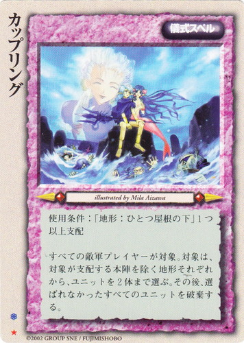 ![]() ![]() | シングル・イズ・ベスト 儀式スペル モンスター・コレクション ◆ デックに1枚制限。対戦相手パーティ1つの、すべてのユニットに効果。対戦相手は、そのパーティからユニット1体を選ぶ。そして、選ばれた1体を除いた、その他のユニットを破棄する。このカードは本陣のパーティを対象にはできない。 illustrated by Toshihisa Tanaka |