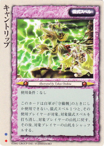 ![]() ![]() | キャンセレーション 儀式スペル 魔法帝国の興亡 ▲ 使用条件:「ストーン・サークル」1つ以上支配、または自軍領土2つ以上支配 「ストーン・サークル」を1つ以上支配していない場合、自軍本陣のユニット1体を破棄することが代償。儀式スペルを使用したプレイヤー1人が対象。対象プレイヤーが使用した儀式スペルの効果を打ち消す。このカードは自軍ターン以外でも使用できる。 illustrated by Chiaki Ogishima |