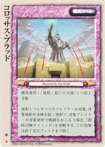 ![]() ![]() | コロッサス・ブラッド 儀式スペル 六王国の戦火 ★ ブロック:六王国 使用条件:「地形:乾いた大地」1つ以上支配 地形1つとすべてのプレイヤーが対象。対象地形が本陣を除く地形で、対象プレイヤーが対象地形で戦闘をおこなう場合、「即時召喚フェイズ」を省略する。この効果は終了宣言フェイズまで続く。 illustrated by Yuji Kaida |