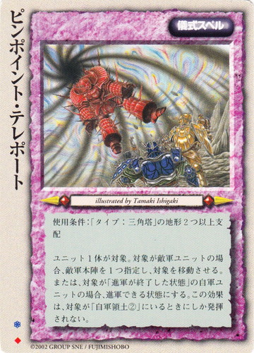 ![]() ![]() | ピンポイント・テレポート 儀式スペル 六王国の戦火 ◆ ブロック:六王国 使用条件:「タイプ:三角塔」の地形2つ以上支配 ユニット1体が対象。対象が敵軍ユニットの場合、敵軍本陣を1つ指定し、対象を移動させる。または、対象が「進軍が終了した状態」の自軍ユニットの場合、進軍できる状態にする。この効果は、対象が「自軍領土②」にいるときにしか発揮されない。 illustrated by Tamaki Ishigaki |