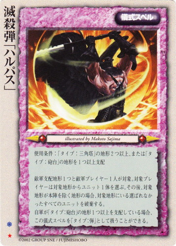 ![]() ![]() | 滅殺弾「ハルパス」 儀式スペル 六王国の戦火 ★ ブロック:六王国 使用条件:「タイプ:三角塔」の地形2つ以上、または「タイプ:砲台」の地形を1つ以上支配 敵軍支配地形1つと敵軍プレイヤー1人が対象。対象プレイヤーは対象地形からユニット1体を選ぶ。その後、対象地形が本陣を除く地形の場合、対象地形にいる選ばれなかったすべてのユニットを破棄する。 自軍が「タイプ:砲台」の地形1つ以上を支配している場合、この儀式スペルを「タイプ:弾」として扱うことができる。 illustrated by Makoto Sajima |