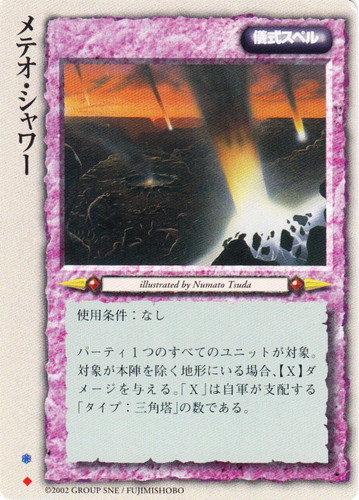 ![]() ![]() | メテオ・シャワー 儀式スペル 六王国の戦火 ◆ ブロック:六王国 使用条件:なし パーティ1つのすべてのユニットが対象。対象が本陣を除く地形にいる場合、【X】ダメージを与える。「X」は自軍が支配する「タイプ:三角塔」の数である。 illustrated by Numato Tsuda |