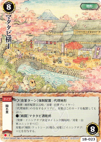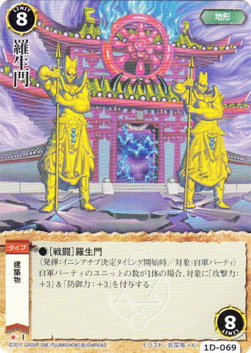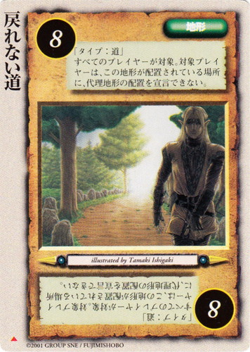 ![]() ![]() | 男道 地形 空中庭園の降臨 ▲ リミット:10 「地形:男道」が戦場に3つ以上配置され、すべての本陣を「地形:男道」だけを使って歩行で進軍できるようになったときに効果。 本陣と「地形:男道」以外のすべての地形は、戦場に存在できなくなり、その上のユニットごと破棄される。この効果は一文目の条件が満たされている限り続く。 illustrated by Katsuya Terada |