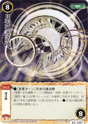 ![]() ![]() | 魔法陣「水瓶」 地形 モンスター・コレクション ● リミット:8 この地形には、「属性:水」ユニットを「普通召喚」できる。ただしこの魔法陣「水瓶」が配置されたターンは、この効果を使用できない。 illustrated by C-Show |