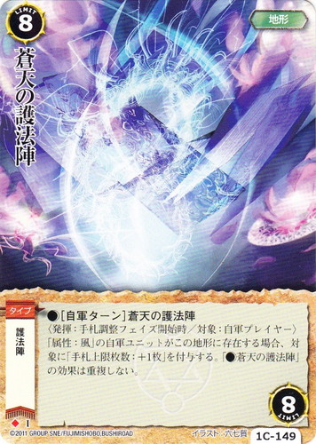 ![]() ![]() | 魔法陣「風車」 地形 聖都の決闘者(リコル) ● リミット:8 この地形には、「属性:風」ユニットを「普通召喚」できる。ただしこの魔法陣「風車」が配置されたターンは、この効果を使用できない。 illustrated by Mikitamako |