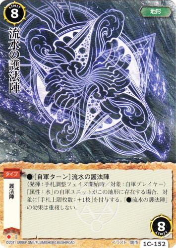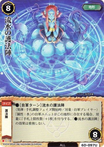 ![]() ![]() | 6D-097U 流水の護法陣 地形 悠久のハルシオン ◆ ブロック:I/II/III/IV/V/VI リミット:8 勢力:ALL タイプ:護法陣 ●[自軍ターン]流水の護法陣 〈発揮:手札調整フェイズ開始時/対象:自軍プレイヤー〉 「属性:水」の自軍ユニットがこの地形に存在する場合、対象に「手札上限枚数:+1枚」を付与する。「●流水の護法陣」の効果は重複しない。 illustrated by 秋月壱葉 |