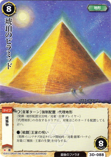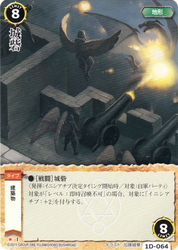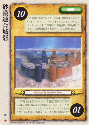 ![]() ![]() | 砦 地形 古代帝国の遺産 ◆ リミット:9 この地形では、「レベル:3」以下のユニットを「即時召喚」することができる。この地形が戦場から破棄されるとき、このカードを手札に戻してもよい。 illustrated by Yutaka Nanten |
