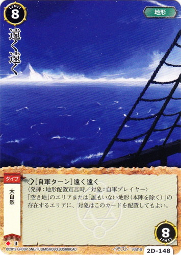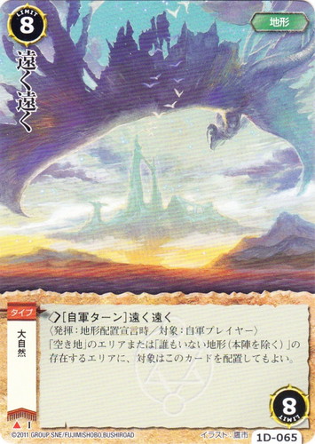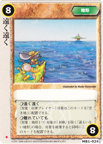 ![]() ![]() | 遠く遠く 地形 モンスター・コレクション ◆ リミット:8 この地形は、戦場に存在する「まだ地形が配置されていない場所」か「誰もいない地形」ならば、どこにでも配置できる。また、普通に自軍の「支配地形」と入れ替えて配置することもできる。 illustrated by Sei Itou |