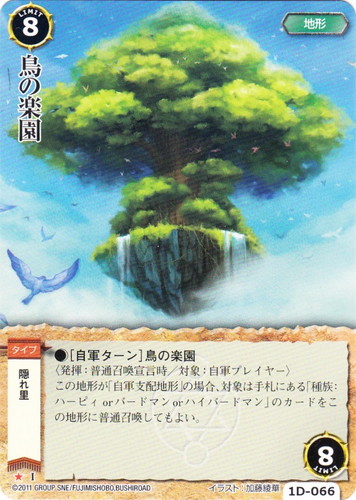 ![]() ![]() | 春の息吹 地形 空中庭園の降臨 ♣ リミット:* デックに1枚制限。この地形は「リミット:0体」、この地形は自分の支配地形と入れ替えでしか配置できない。この地形を配置したとき、すべての「代理地形」を「表」向きにする。「表」にされたカードが「地形カード」の場合、そのまま地形として配置され続ける。それ以外の場合は、ふたたびもとの「代理地形」に戻す。 illustrated by Mikitamako |