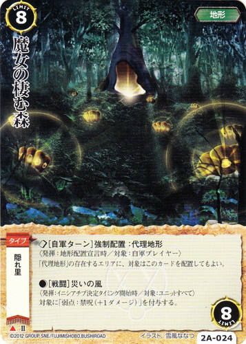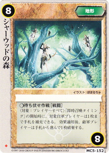![]() ![]() | 叫び声の響く森 地形 太陽王の覚醒 ★ リミット:6 すべてのプレイヤーが対象。対象プレイヤーはこの地形で戦闘を行う際、「戦闘スペル/消耗品」の使用を宣言できない。 illustrated by Mikitamako |