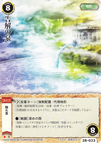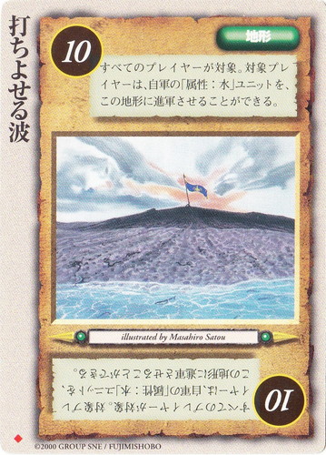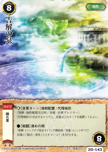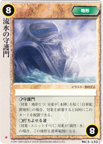 ![]() ![]() | せせらぎの音 地形 モンスター・コレクション ▲ リミット:8 この地形には、これを配置したプレイヤーの「属性:水」ユニットが、戦場のどこからでも進軍できる。 illustrated by Masahiro Satou |