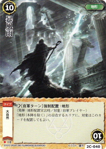 ![]() ![]() | 6D-100C 暴風雨 地形 悠久のハルシオン ▲ ブロック:I/II/III/IV/V/VI リミット:10 勢力:ALL タイプ:大自然 【枚数制限解除】(このカードはデックに50枚まで組み込める) 【強制配置】地形(本陣を除く地形のあるエリアに配置できる) illustrated by 巴ヨシヤス |