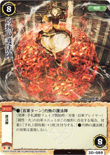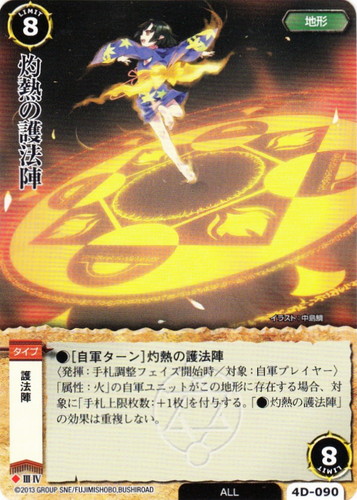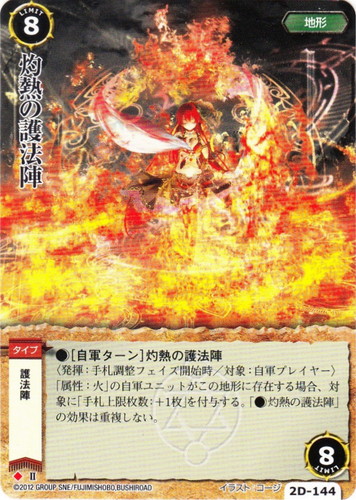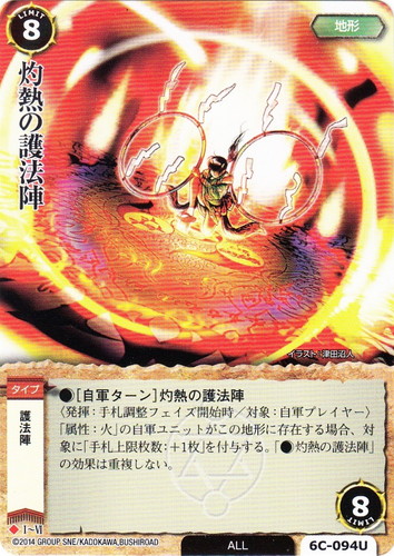 ![]() ![]() | 6C-094U 灼熱の護法陣 地形 アゾールの黒い旋風 ◆ ブロック:V/VI リミット:8 勢力:ALL タイプ:護法陣 ●[自軍ターン]灼熱の護法陣 〈発揮:手札調整フェイズ開始時/対象:自軍プレイヤー〉 「属性:火」の自軍ユニットがこの地形に存在する場合、対象に「手札上限枚数:+1枚」を付与する。「●灼熱の護法陣」の効果は重複しない。 illustrated by 津田沼人 |