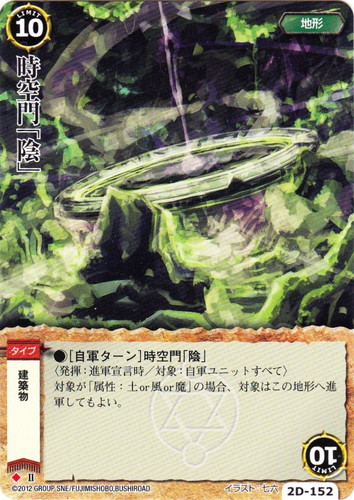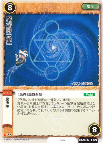![]() ![]() | M20A-149 魔法陣「渦」 地形 太陽の金の竜姫 ▲ ブロック:AN リミット:8 勢力:ALL タイプ:魔法陣 [条件]高位召喚【Field】 〈発揮:この地形配置時/対象:この地形〉 対象が自軍領土に存在しており、かつ敵軍支配地形ではない場合、対象に自軍手札にあるユニットカード1枚を選んで行動完了で召喚してもよい。ただしリミット調整の発生するユニットカードは選べない。 illustrated by 佐藤正浩 |