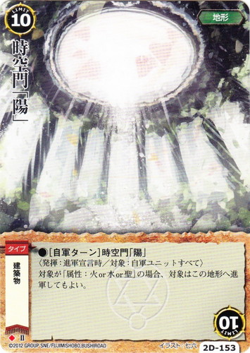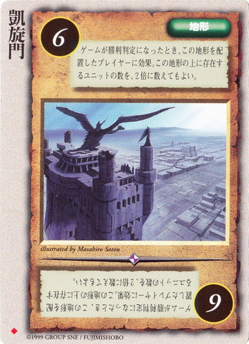 ![]() ![]() | 凱旋門 地形 空中庭園の降臨 ◆ リミット:6 ゲームが勝利判定になったとき、この地形を配置したプレイヤーに効果。この地形の上に存在するユニットの数を、2倍に数えてもよい。 illustrated by Masahiro Satou |