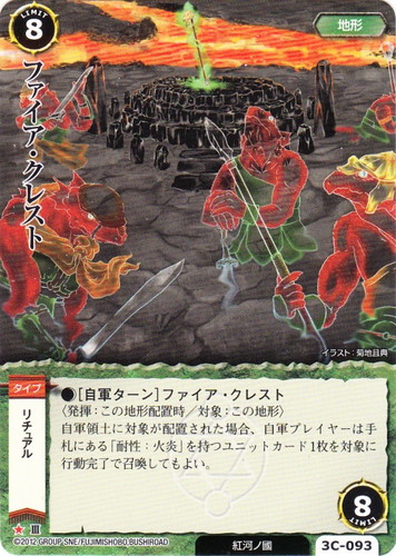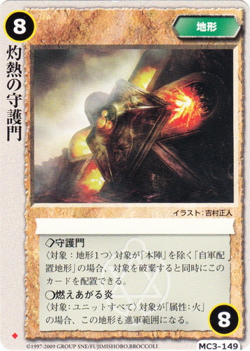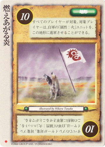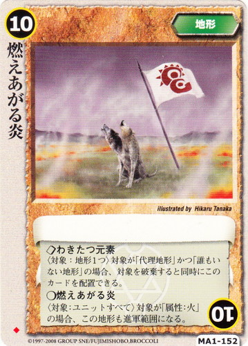 ![]() ![]() | たちのぼる煙 地形 モンスター・コレクション ▲ リミット:8 この地形には、これを配置したプレイヤーの「属性:火」ユニットが、戦場のどこからでも進軍できる。 illustrated by Masahiro Satou |