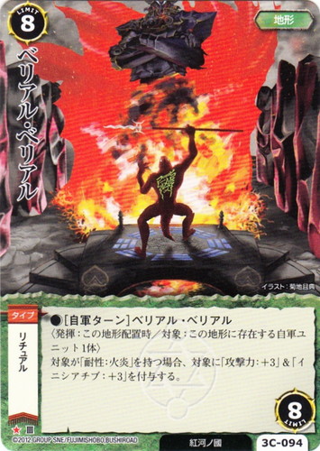 ![]() ![]() | 6A-018T 鬼炎万里 地形 雷姫 ● ブロック:V/VI リミット:8 勢力:豪天城の戦鬼 タイプ:大自然 ●[自軍ターン]鬼炎万里 〈発揮:この地形配置時/対象:この地形に存在する自軍ユニット1体〉 対象が「種族:鬼神衆」の場合、対象に「攻撃力:+3」&「イニシアチブ:+3」&「スペル:火」を付与する。 illustrated by 一葉モカ |