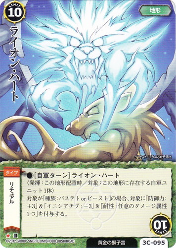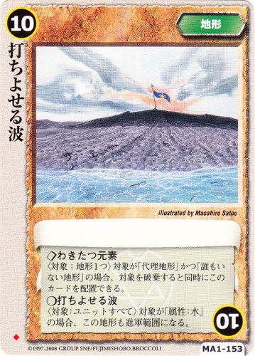 ![]() ![]() | 枯れた虹 地形 モンスター・コレクション ★ リミット:8 この地形には、1つの「属性」のユニットだけで構成されたパーティしか進軍できず、存在できない。1つのパーティに2つ以上の「属性」のユニットが存在した場合、そのパーティのすべてのユニットは、即座に破棄される。 illustrated by Hiroyuki Katou&Keisuke Gotou |