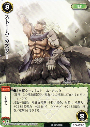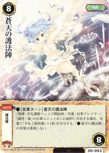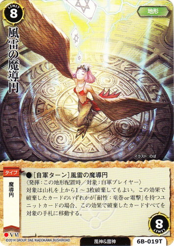 ![]() ![]() | 6B-020T 魔法陣「風雷」 地形 風神竜 ● ブロック:V/VI リミット:8 勢力:風神&雷神 タイプ:魔法陣 ●[自軍ターン]魔法陣「風雷」 〈発揮:この地形配置時/対象:この地形〉 「自軍領土」に対象が配置された場合、自軍プレイヤーは手札にある「耐性:竜巻or電撃」を持つユニットカード1枚を対象に行動完了で召喚してもよい。 illustrated by のば |