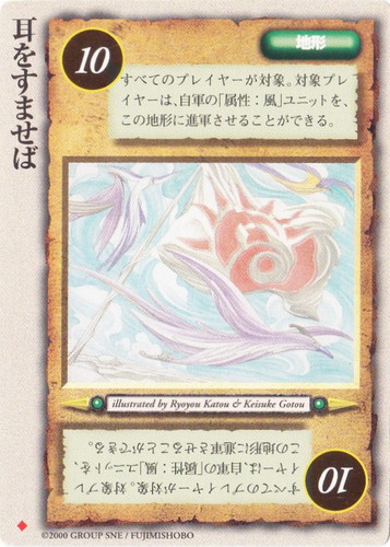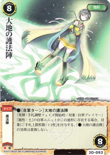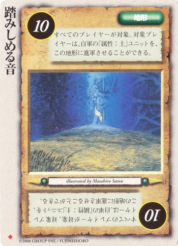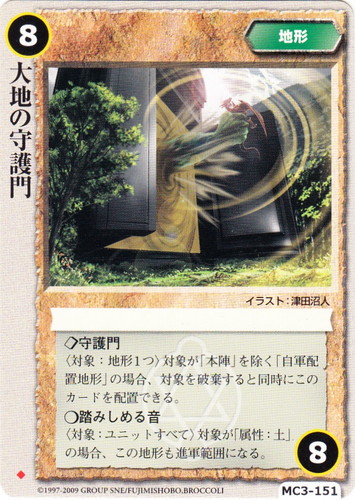![]() ![]() | 大地のささやき 地形 聖都の決闘者(リコル) ▲ リミット:8 この地形には、これを配置したプレイヤーの「属性:土」ユニットが、戦場のどこからでも進軍できる。 illustrated by Masahiro Satou |