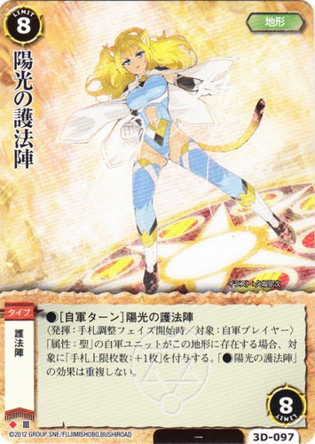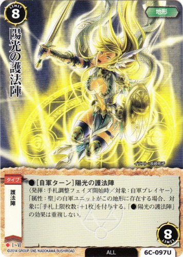 ![]() ![]() | 3D-097 陽光の護法陣 地形 銀嶺のリヒテルス ◆ ブロック:III リミット:8 タイプ:護法陣 ●[自軍ターン]陽光の護法陣 〈発揮:手札調整フェイズ開始時/対象:自軍プレイヤー〉 「属性:聖」の自軍ユニットがこの地形に存在する場合、対象に「手札上限枚数:+1枚」を付与する。「●陽光の護法陣」の効果は重複しない。 illustrated by 久坂宗次 |