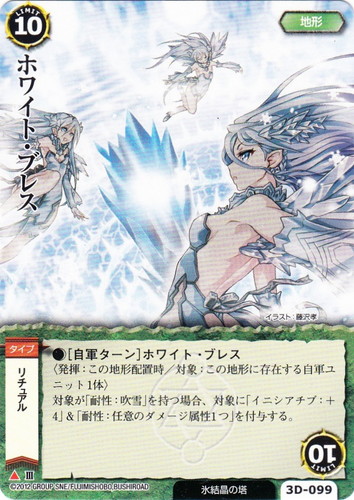 ![]() ![]() | 3D-099 ホワイト・ブレス 地形 銀嶺のリヒテルス ▲ ブロック:III リミット:10 勢力:氷結晶の塔 タイプ:リチュアル ●[自軍ターン]ホワイト・ブレス 〈発揮:この地形配置時/対象:この地形に存在する自軍ユニット1体〉 対象が「耐性:吹雪」を持つ場合、対象に「イニシアチブ:+4」&「耐性:任意のダメージ属性1つ」を付与する。 illustrated by 藤沢孝 |