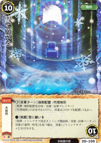 ![]() ![]() | 3D-100 雪に願いを 地形 銀嶺のリヒテルス ★ ブロック:III リミット:10 勢力:氷結晶の塔 タイプ:大自然 ◇[自軍ターン]強制配置:代理地形 〈発揮:地形配置宣言時/対象:自軍プレイヤー〉 「代理地形」の存在するエリアに、対象はこのカードを配置してもよい。 ●[戦闘]雪に願いを 〈発揮:イニシアチブ決定タイミング開始時/対象:自軍パーティ〉 対象が「耐性:吹雪」を持つ場合、対象に「イニシアチブ:+2」を付与する。 illustrated by 雪風ななつ |