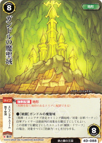 ![]() ![]() | 4D-088 ガンドルの魔聖域 地形 アポカリプスの魔剣 ★ ブロック:III/IV リミット:8 勢力:鉄と鋼の王国 タイプ:地下空洞/エレメンタル・ストーム 【強制配置】地形(本陣を除く地形のあるエリアに配置できる) ●[戦闘]ガンドルの魔聖域 〈発揮:イニシアチブ決定タイミング開始時/対象:自軍パーティ〉 自軍プレイヤーは最前列の対象を行動完了にしてもよい。この効果で行動完了にしたユニットが「種族:ドワーフ」の場合、対象すべてに「防御力:+1」を付与する。 illustrated by ぴぃたぁそると |