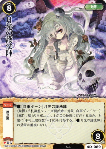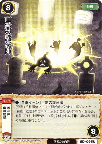 ![]() ![]() | 6D-095U 亡霊の護法陣 地形 悠久のハルシオン ◆ ブロック:V/VI リミット:8 勢力:死者の謝肉祭 タイプ:幽霊屋敷/護法陣 ●[自軍ターン]亡霊の護法陣 〈発揮:手札調整フェイズ開始時/対象:自軍プレイヤー〉 「種族:亡霊」の自軍ユニットがこの地形に存在する場合、対象に「手札上限枚数:+1枚」を付与する。「●亡霊の護法陣」の効果は重複しない。 illustrated by 長崎祐子 |