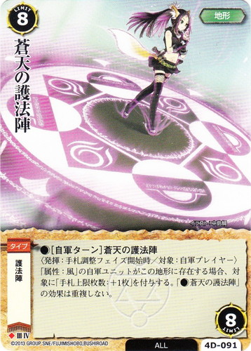![]() ![]() | 4D-091 蒼天の護法陣 地形 アポカリプスの魔剣 ◆ ブロック:III/IV リミット:8 勢力:ALL タイプ:護法陣 ●[自軍ターン]蒼天の護法陣 〈発揮:手札調整フェイズ開始時/対象:自軍プレイヤー〉 「属性:風」の自軍ユニットがこの地形に存在する場合、対象に「手札上限枚数:+1枚」を付与する。「●蒼天の護法陣」の効果は重複しない。 illustrated by 中島鯛 |