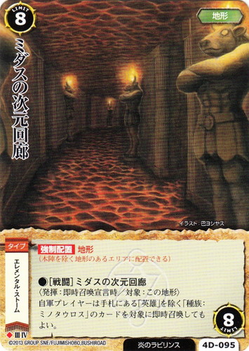 ![]() ![]() | 4D-095 ミダスの次元回廊 地形 アポカリプスの魔剣 ◆ ブロック:III/IV リミット:8 勢力:炎のラビリンス タイプ:エレメンタル・ストーム 【強制配置】地形(本陣を除く地形のあるエリアに配置できる) ●[戦闘]ミダスの次元回廊 〈発揮:即時召喚宣言時/対象:この地形〉 自軍プレイヤーは手札にある「英雄」を除く「種族:ミノタウロス」のカードを対象に即時召喚してもよい。 illustrated by 巴ヨシヤス |