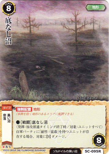 ![]() ![]() | 5C-095R 底なし沼 地形 マーシュラントの魔竜 ★ ブロック:IV/V リミット:8 勢力:ゾルドイルの黒い沼 タイプ:奈落/黒い沼 【強制配置】地形(本陣を除く地形のあるエリアに配置できる) ●[戦闘]底なし沼 〈発揮:後攻普通タイミング終了時/対象:ユニットすべて〉 自軍パーティに「耐性:猛毒」を持つユニットが存在する場合、対象に【9】ダメージ。 illustrated by 巴ヨシヤス |