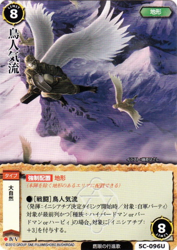 ![]() ![]() | 5C-096U 鳥人気流 地形 マーシュラントの魔竜 ◆ ブロック:IV/V リミット:8 勢力:鷹眼の行進歌 タイプ:大自然 【強制配置】地形(本陣を除く地形のあるエリアに配置できる) ●[戦闘]鳥人気流 〈発揮:イニシアチブ決定タイミング開始時/対象:自軍パーティ〉 対象が最前列かつ「種族:ハイバードマンorバードマンorハーピィ」の場合、対象に「イニシアチブ:+3」を付与する。 illustrated by 藤原ひさし |