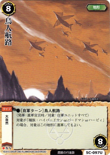 ![]() ![]() | 5C-097U 鳥人航路 地形 マーシュラントの魔竜 ◆ ブロック:IV/V リミット:8 勢力:鷹眼の行進歌 タイプ:大自然 ●[自軍ターン]鳥人航路 〈発揮:進軍宣言時/対象:自軍ユニットすべて〉 対象が「種族:ハイバードマンorバードマンorハーピィ」の場合、対象はこの地形に進軍してもよい。 illustrated by 久坂宗次 |