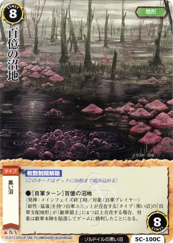 ![]() ![]() | 5C-100C 百億の沼地 地形 マーシュラントの魔竜 ▲ ブロック:IV/V リミット:8 勢力:ゾルドイルの黒い沼 タイプ:黒い沼 【枚数制限解除】(このカードはデックに50枚まで組み込める) ●[自軍ターン]百億の沼地 〈発揮:メインフェイズ終了時/対象:自軍プレイヤー〉 「耐性:猛毒」を持つ自軍ユニットが存在する「タイプ:黒い沼」の「自軍支配地形」が「敵軍領土」に4つ以上存在する場合、対象は敵軍本陣を陥落してゲームに勝利したことになる。 illustrated by のば |