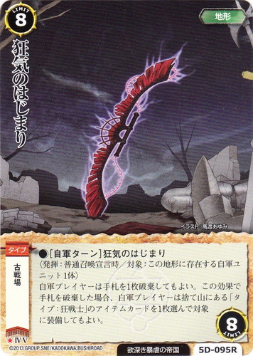 ![]() ![]() | 5D-095R 狂気のはじまり 地形 ジオテランの歌姫 ★ ブロック:IV/V リミット:8 勢力:欲深き暴虐の帝国 タイプ:古戦場 ●[自軍ターン]狂気のはじまり 〈発揮:普通召喚宣言時/対象:この地形に存在するユニット1体〉 自軍プレイヤーは手札を1枚破棄してもよい。この効果で手札を破棄した場合、自軍プレイヤーは捨て山にある「タイプ:狂戦士」のアイテムカードを選んで対象に装備してもよい。 illustrated by 高渡あゆみ |