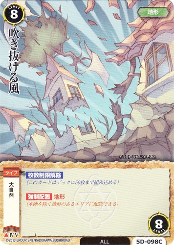 ![]() ![]() | 5D-098C 吹きぬける風 地形 ジオテランの歌姫 ▲ ブロック:IV/V リミット:8 勢力:ALL タイプ:大自然 【枚数制限解除】(このカードはデックに50枚まで組み込める) 【強制配置】地形(本陣を除く地形のあるエリアに配置できる) illustrated by ぴぃたぁそると |